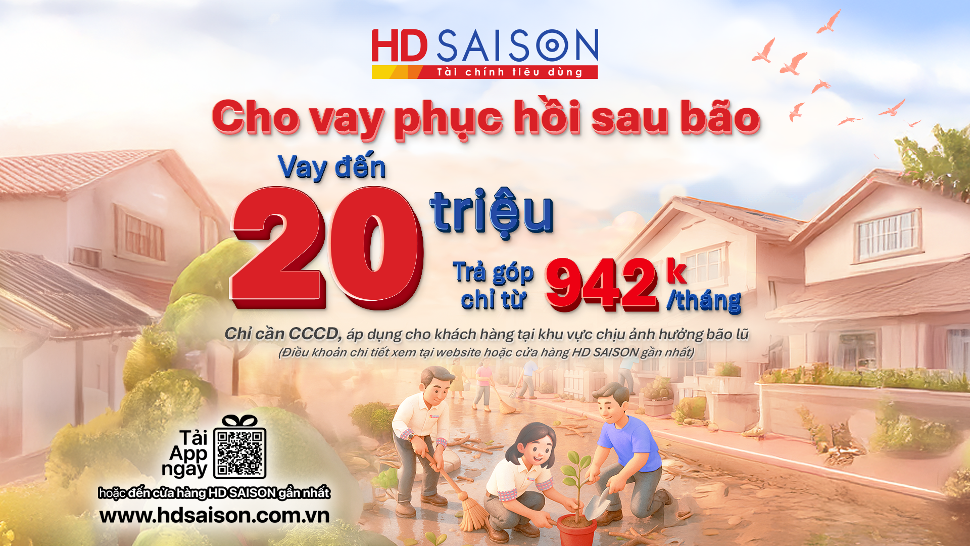 Nêu cao tinh thần tương thân tương ái, HD SAISON mong muốn có thể nhanh chóng giúp đỡ, đem đến các sự lựa chọn phù hợp với nhu cầu khôi phục tài sản, sửa chữa nhà cửa hay mua sắm vật dụng thiết yếu. Chỉ cần CCCD, khách hàng hiện hữu tại các tỉnh thành bị ảnh hưởng nặng bởi bão lũ có thể tiếp cận nguồn tài chính chính thống Phục hồi sau bão (*) có lãi suất thấp chỉ 1%/tháng (tương đương 12%/năm):