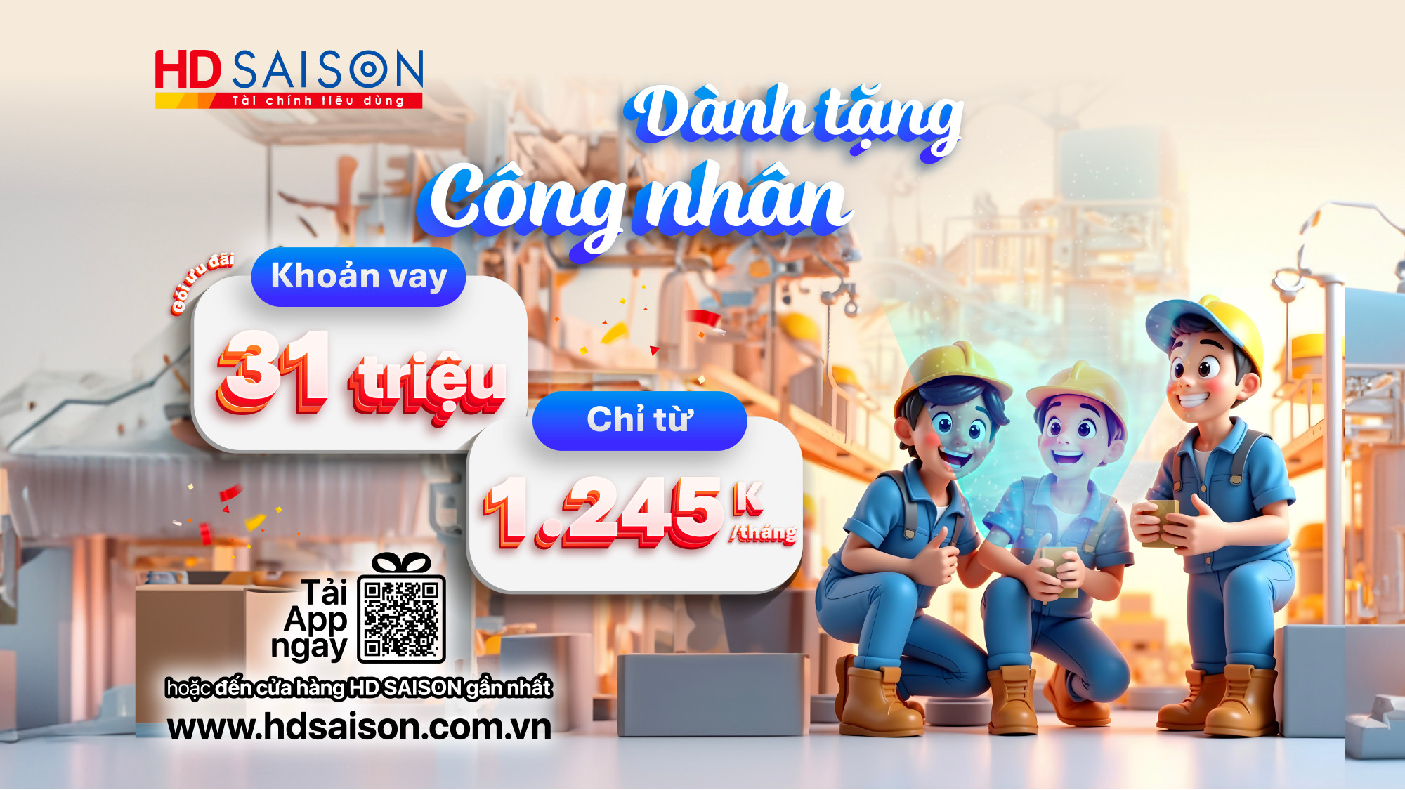 Tiếp nối sự thành công từ những chương trình đặc biệt và thiết thực được thiết kế dành riêng cho Đoàn viên, Công nhân từ gói tín dụng 15.000 tỷ phi lợi nhuận, HD SAISON tự tin mang đến sự an tâm và trọn vẹn hơn cho người lao động, Đoàn viên, Công nhân thông qua giải pháp tài chính ổn định xuyên suốt trong năm 2025. Khoản vay không chỉ giúp bạn chủ động hơn trong chi tiêu, mua sắm hay lo cho con học hành, mà còn là cách để HD SAISON gửi lời tri ân, tôn vinh giá trị lao động chân chính – những con người âm thầm tạo nên sức sống cho nền kinh tế: