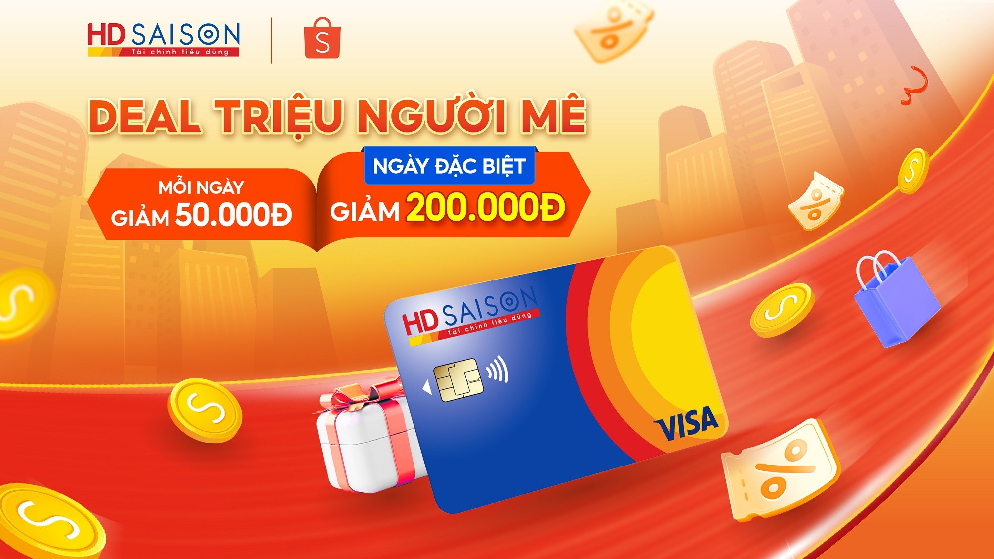 Quý khách hàng sẽ có hơn 9 tháng để trải nghiệm deal hấp dẫn mỗi ngày tại Shopee khi thanh toán bằng thẻ tín dụng quốc tế HD SAISON đấy. Ưu đãi lên đến 200.000 đồng đang chờ bạn: