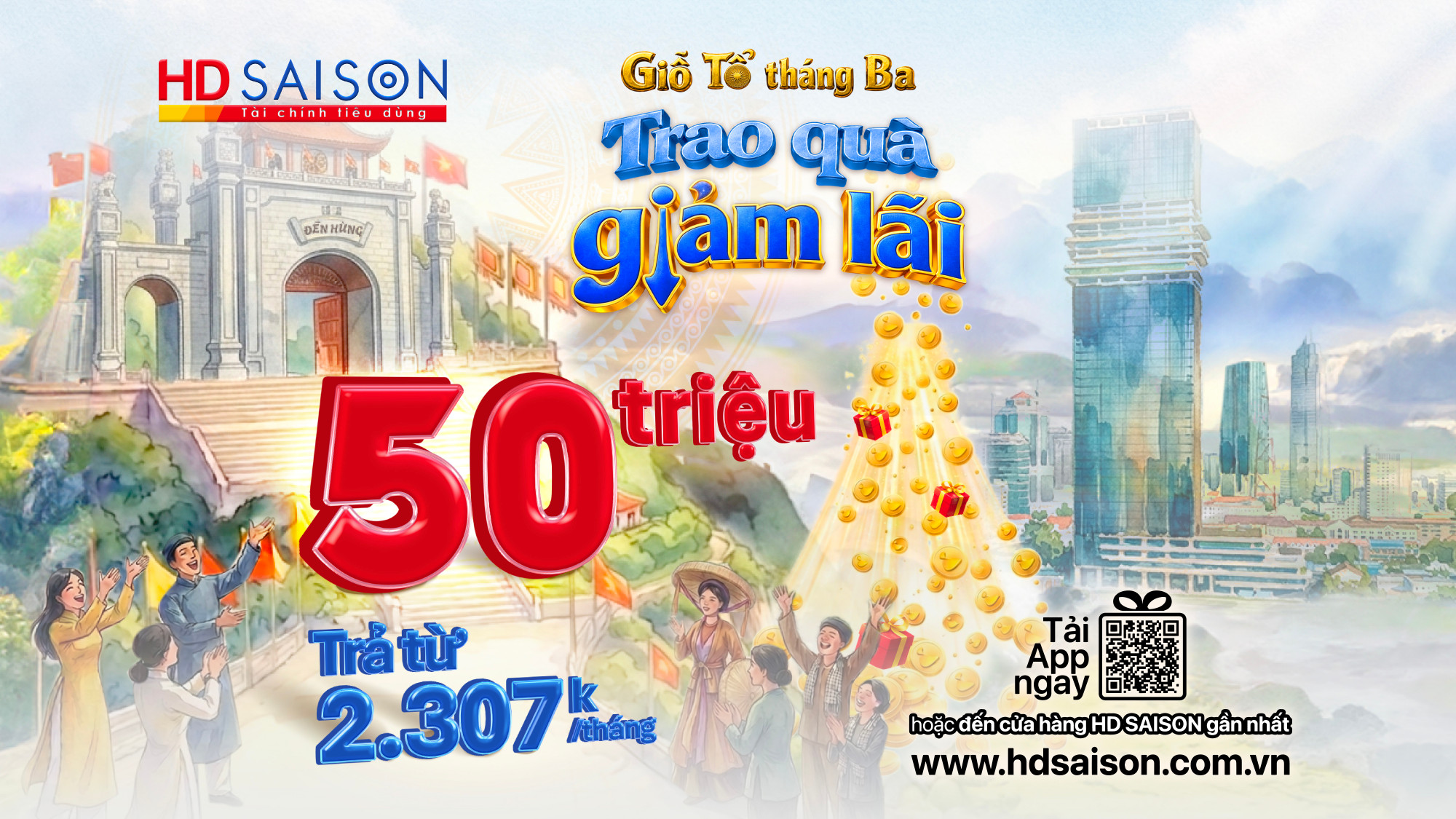 Hướng về đất Tổ, ngày Mùng 10 tháng 3 là dịp để mỗi người con đất Việt bày tỏ lòng biết ơn sâu sắc đến cha ông. Hòa chung không khí ấy, HD SAISON mang đến chương trình “Giỗ Tổ tháng Ba - Trao quà, giảm lãi” với thật nhiều ưu đãi hấp dẫn bên cạnh những phần quà vô cùng giá trị, giúp mọi dự định sắm sửa hay kế hoạch cho kỳ nghỉ lễ của Quý khách được thực hiện dễ dàng và trọn vẹn.