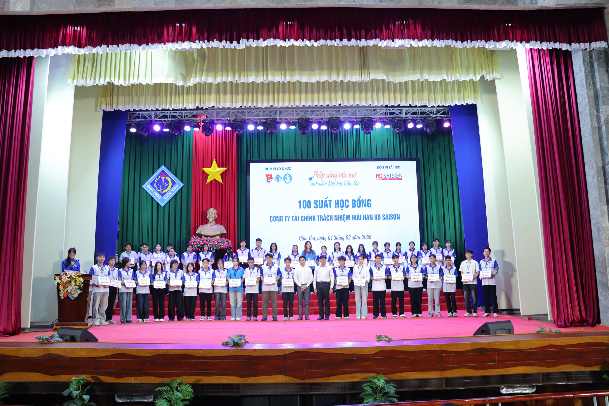 Trong không khí rộn ràng những ngày đầu Xuân mới, khi Tết đang gõ cửa, ngày 01/02/2026, HD SAISON phối hợp cùng Ban Thường vụ Đoàn Đại học Cần Thơ tổ chức chương trình “Thắp sáng ước mơ sinh viên Đại học Cần Thơ” năm học 2025 - 2026, trao 100 suất học bổng cho sinh viên có hoàn cảnh khó khăn, học tập tốt, với tổng trị giá 500 triệu đồng.