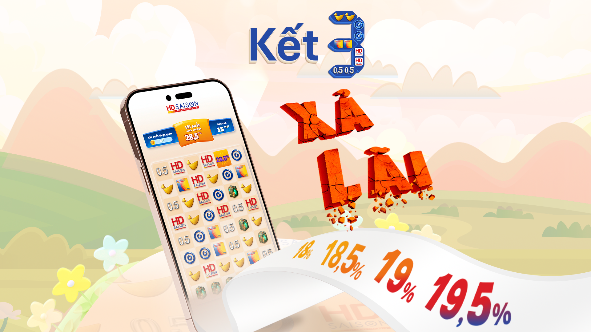 Đặc biệt, cơ hội vay hấp dẫn lên đến 19 triệu với mức lãi suất ưu đãi chỉ 18%/năm – thanh toán linh hoạt chỉ từ 1.080k/tháng, đang chờ bạn tham gia tại thử thách "Kết 3, xả lãi" trên App HD SAISON.