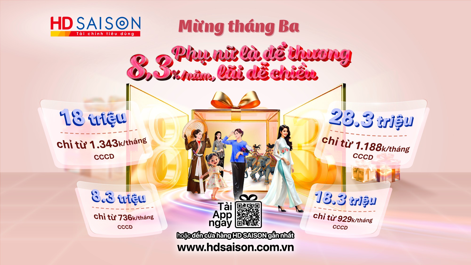 Mừng tháng 3 HD SAISON triển khai chương trình ưu đãi đặc biệt tri ân khách hàng với lãi suất chỉ từ 8,3%/ năm, tương đương 0,69%/tháng cùng khoản vay linh động lên đến 28,3 triệu đồng - dễ dàng chiều lòng mọi nhu cầu tài chính từ mua sắm, nâng cấp không gian sống, đầu tư phát triển bản thân hay chăm lo cho gia đình.